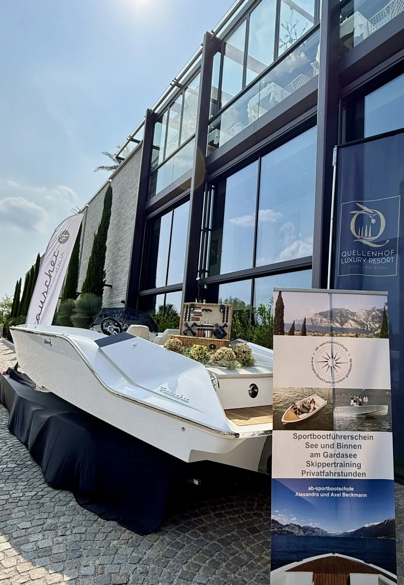 Am letzten Donnerstag fand unsere erste Prüfung zu den Sportbootführerscheinen See und Binnen im Quellenhof in Lazise statt. Wir freuen uns sehr in diesem exklusiven und angenehmen Rahmen unsere Ausbildung und Prüfung durchzuführen und noch mehr freuen wir uns über das hervorragende Ergebni. Für alle Teilnehmer endete dieser Tag mit einem strahlenden Lächeln im Gesicht und einem Führerschein in den Händen. Unsere Schüler genossen die praktische Ausbildung und Prüfung auf der Designikone Frauscher 747 Mirage. Hier zeigten alle dem Prüfer erstklassige Manöver. Wir wünschen allen viel Vergnügen beim Bootfahren und freuen uns auf ein Wiedersehen auf dem Gardasee. Auch im nächsten Jahr finden Kurse und Prüfungen im Quellenhof statt.