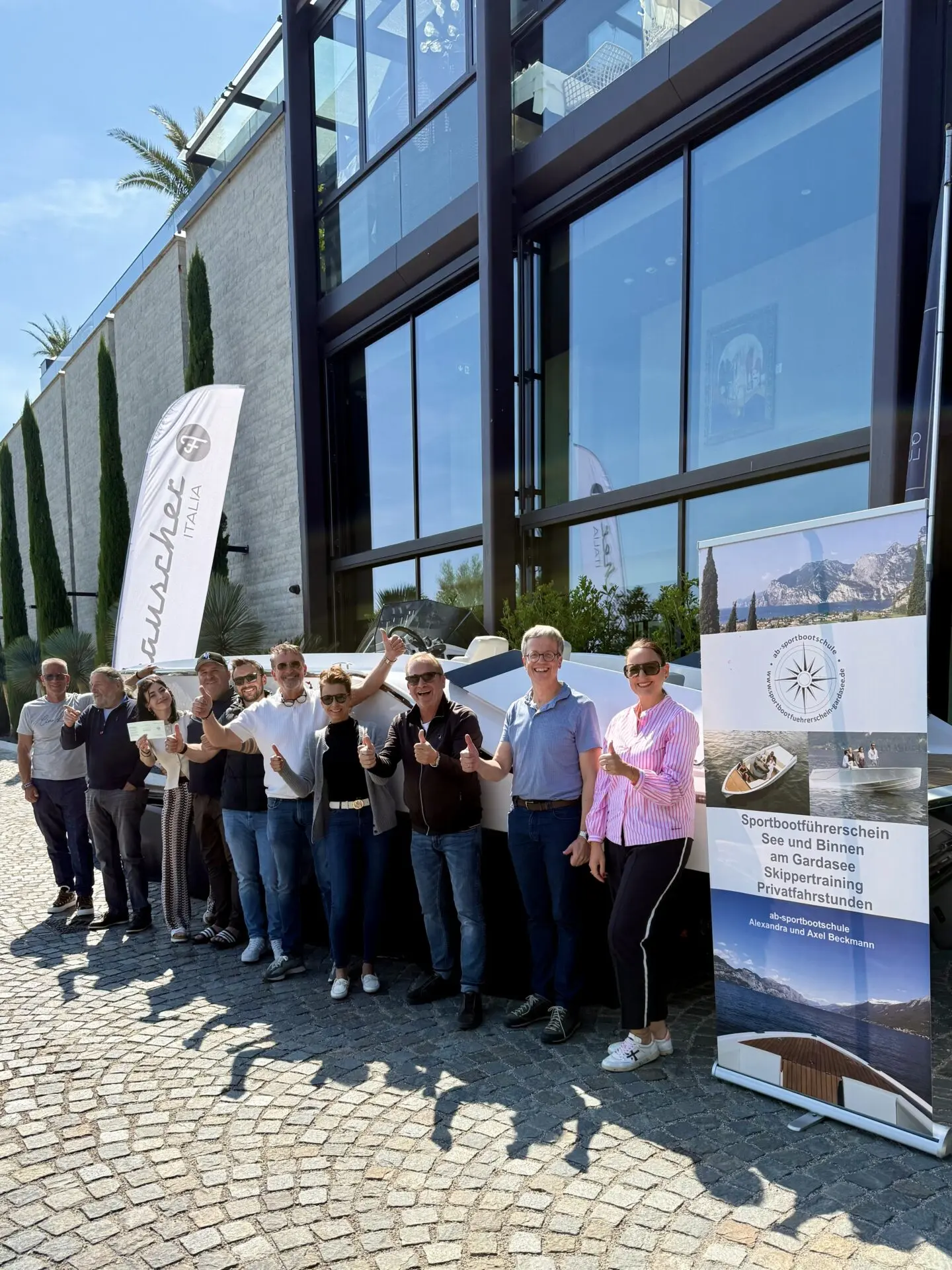 Alexandra und Axel Beckmann von Sportbootführerschein-Gardasee freuen sich zusammen mit Nautica Feltrinelli und weiteren Partnern über den großartigen Auftakt am Gardasee!